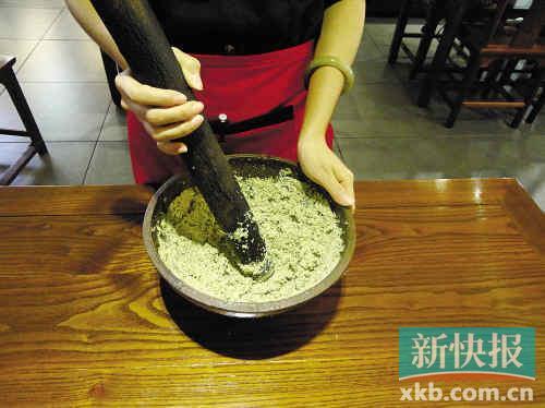 除了用开水冲泡的擂茶,还有一种“糊糊擂茶”,跟广东客家人吃的擂茶很相似。在广州呆了11年的阿谭介绍说,这种擂茶的原料多了一样炒米,并且不是用开水冲泡,而是用水煮,做法相对复杂一些。“我们吃得少,一般是小孩子满月摆酒时吃,很容易饱肚子。不像开水冲泡的擂茶,喝了还助消化。”