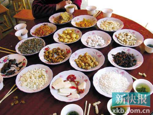 光做好擂茶还不够,桌上必须要摆点吃的才叫喝擂茶,客人越贵重或设宴越隆重摆得越多。“都是自家做的小吃,像馓子、油炸锅巴、米面皮、米泡泡、萝卜干、洋姜等等。”阿龙说,这些东西家家都会做,也是约定俗成的喝擂茶必摆的。“馓子就是糯米蒸熟后,晾干,摊成薄饼,越薄越好;米面皮的做法跟广东肠粉类似,摊在瓷盆里撒上芝麻、生姜,晾干后剪成小块,用绳串起来挂在屋梁上;米泡泡就是熟糯米一粒粒晾干后用油炸或用砂子炒……”