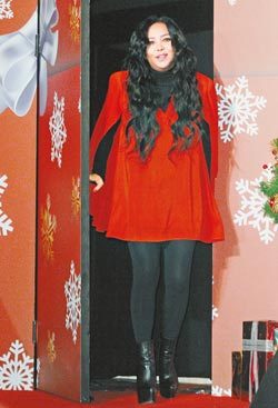 阿妹13日穿宽松连身洋装修饰身材,希望能看起来稍微瘦一点。(图片来源:台湾《中国时报》 李威德摄)