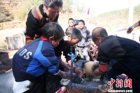 15日,凉山美姑县岗洛村小学99名小学生在第一顿免费午餐前洗手。 高寒 摄