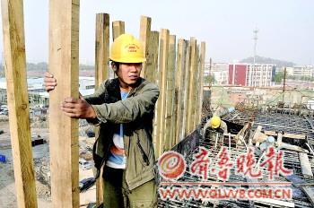“90后”木工李昊坤来自河南商丘,9月份刚从南京来到济南,刚开始干木工,稚嫩的脸上还含着羞涩的笑容。他正站在高架桥边缘,为钉钉子的师傅把扶着木桩。胡银峰师傅用布满老茧的手,一颗一颗地将钉子钉进工地的架子里。