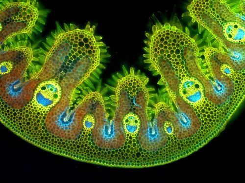 为了容易观察细胞的组成,英国植物学家菲尔盖兹(Phil Gates)将滨草叶子横切面切片、染上荧光染剂,让一个接着一个的维管束,看起来像是一串笑脸,其中迷人的大眼睛是运送水分的木质部,开口笑的嘴巴是运送醣类的韧皮部,揭露大自然令人难以想象的复杂奇巧。