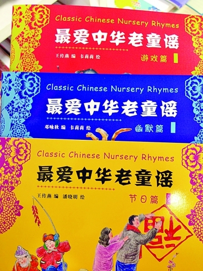 随后记者走访了南京两家大型的图书店,在新华书店,在众多的诗词、故事、儿歌书当中,有一本大红色封面装帧的童谣书《最爱中华老童谣》,分为“游戏”“节日”“幽默”三篇,共44首,每首都配上传统插画。此外还有《摇啊摇,摇到外婆桥》、以及《中文童谣》,其中内容多有重合。另外还有一本50首的《英文童谣》。