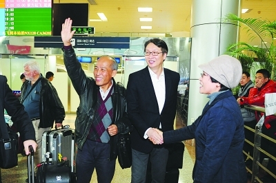 中国时报总监林圣芬(左一)与中时电子报总编辑刘善群(图中)抵宁。 范晓林刘 浏 摄