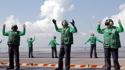 在美军航母长期出海和战斗值勤过程中,形成了一系列航母类战舰特有的海军文化和行为方式。特别是在飞行甲板上负责舰载飞机起降服务及战斗维护的舰载航空兵服务保障人员,为减轻管理和指挥工作压力,航母战斗部队的官兵们都根据其任务分工,穿戴不同颜色的工作帽和上衣,由于战斗环境中的噪音较大,有时可达135-140分贝,他们经常使用独特的手势和标志,在相当长时间内形成了美海军舰载航空兵特定的手语,其中向飞行员做出的一些手语信号,形式上非常复杂,有时就象舞蹈步法一样难以顺利掌握。