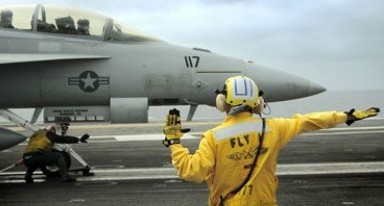 美军舰载战斗机起飞,当飞行员敬礼表示准备妥当,弹射指挥官面向前面,再转身对着飞机,蹲下,手向前指,他的手按在甲版上的同时,发射员按下发射按钮,弹射器压力快速加大,扣在前起落架后面的扣子松开,飞机在剎那间向前冲。