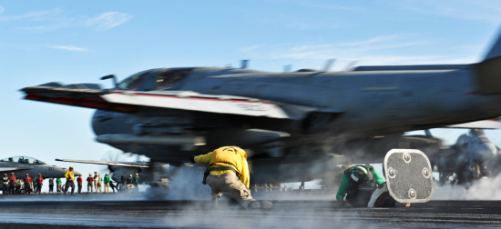 图为美军舰载战斗机起飞,当飞行员敬礼表示准备妥当,弹射指挥官面向前面,再转身对着飞机,蹲下,手向前指,他的手按在甲版上的同时,发射员按下发射按钮,弹射器压力快速加大,扣在前起落架后面的扣子松开,飞机在剎那间向前冲。