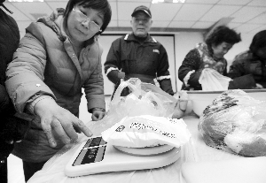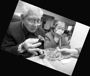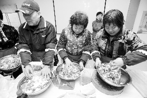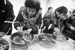 现代快报邀请民间高手,教大家灌香肠的活动,受到了很多居民的欢迎。家住鼓楼区黑龙江路的吴月才老人,提前一个半小时就来到了活动现场。