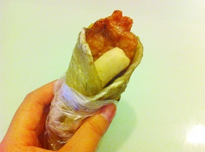 原料:飞饼皮1张、里脊肉1串、火腿肠1根