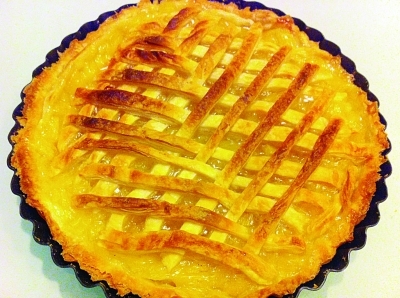 制作方法:1、菠萝切块,放入糖水中熬煮;2、调入玉米淀粉水,一边搅拌一边煮,煮到黏稠状后熄火放凉;3、4张飞饼皮室温回软,3张揉在一起后擀成一个大圆片,稍大于派盘;4、将飞饼片盖在派盘上,用擀面棍把四周多余的饼皮擀下来;5、余下来的饼皮跟另一张飞饼一起揉圆,擀成跟派皮同样大小的圆片,切成条状;6、将放凉的菠萝馅倒在派皮上,将条状饼皮横一条竖一条像编花篮一样覆于菠萝馅上;7、放进事先预热好的烤箱中层,175°C、35分钟。