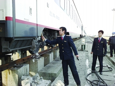 有的时候,列车离到站还有20分钟,列车员检查时发现车门锁芯被冻住了。除冰组就用两个垃圾袋套在一起,倒上开水,放在锁芯上焐,然后用电吹风吹。卫生间的管道管口细,易结冰,除冰组就每30分钟用开水浇一次,由于列车采用集便式厕所,每次浇的时候,令人作呕的尿味就从管道内传上来。除此之外,他们还要在到站前用铁钩将车门滑道内的冰清理出来。而列车到达哈尔滨站后,除冰组还要负责除冰。列车18个车厢,大家先除一侧,再除另一侧,一般要除2小时。