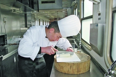 蒋师傅是南京客运段的领导们从南通的五星级大饭店“挖”过来的厨师长。“以前铁路上都是‘自产自销’,不少乘客都反映,说餐车的饭不好吃。餐车不能用明火,用电磁炉不好控制火候,一些复杂的菜式也不方便烧。”但为了满足乘客们“味觉”需要,铁路部门逐渐地从路外挖掘大厨,到列车上来做菜。在前不久举行的上海铁路局职工岗位技能大赛中,蒋师傅凭借着2分10秒切3个豆腐菊花的功夫,当之无愧地获得了第一名。