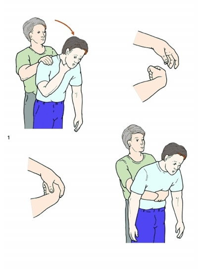 可以从后方环抱住孩子,将一手握拳,另一手放于其上,并置放在病人的肚脐和胸骨的剑突间,用力向着病人的后上方撞挤,这样可以短时间内造成胸腔压力增加而把哽住的异物挤出。