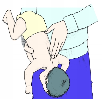 可以小臂托住小孩胸腹部,并保持头低脚高的位置,另一手在背后肩胛骨之间用力拍击4次,无效时可双手向腹部向上推压数次。这样通常会帮助婴儿咳出异物,如果婴儿咳得不像开始那么厉害,可以正常呼吸了,就可以扒开他的嘴看看,如果可以看见东西在他的嘴里或咽喉部,可以用手指夹出来。