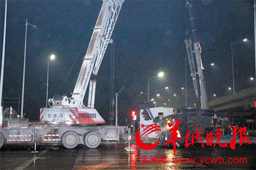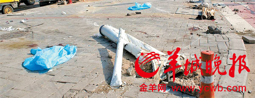 3人被货柜车当场压死昨日,记者赶到现场时,翻倒的大货车已被交警拖走,几名交警还在现场勘查,在立交桥的安全岛上,一根6米多高的红绿灯柱被连根撞倒,安全岛上的几个石墩被撞到几米开外,地上还有大摊的鲜血,几只死者的鞋子还散落在车祸现场。在事故现场还可以看到几条明显的刹车痕迹,几名道路养护工人在对被撞倒的红绿灯柱进行切割。