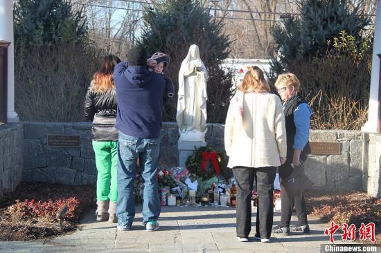 12月15日,美国康涅狄格纽敦的民众在本地天主教堂的圣母像前为发生在当地的校园枪击案死难者肃立默哀。中新社发 李洋 摄