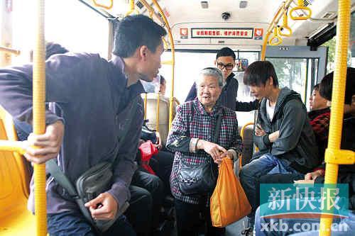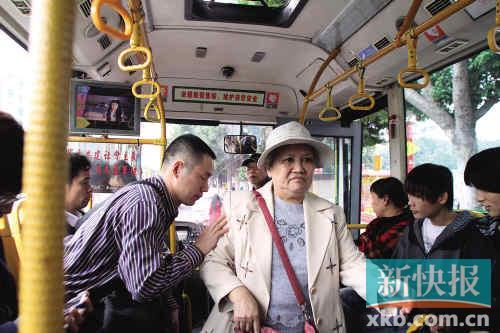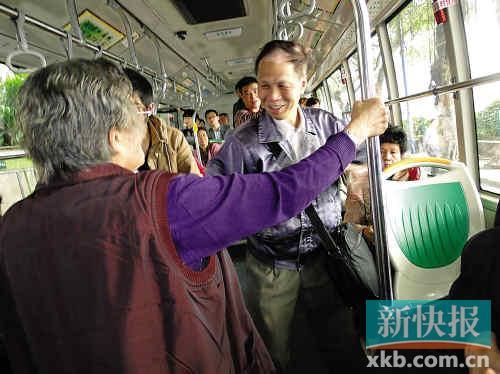 ■14路公交车鹭江站,坐前排的刘先生让座给老婆婆。老人微笑说“只坐一个站就下车”,婉谢了让座。刘先生又将位子让给了另一位老人。评选理由是外地人,也是年轻人,广州会记住你的友爱!(摄影:梁建康)