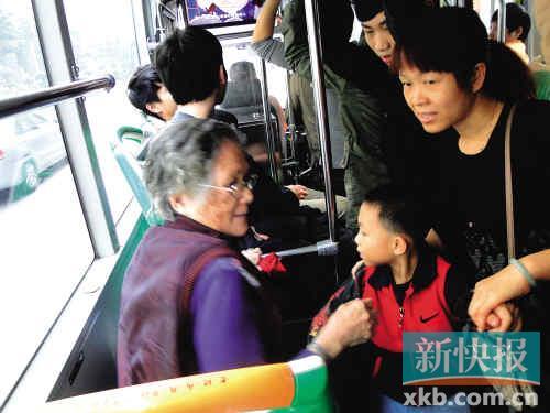 ■128路公交车上,老奶奶上车后,带着年约6岁儿子的妈妈对儿子说说应该给老奶奶让座,小朋友十分听话地站了起来,老奶奶也十分高兴。评选理由美德从小学起,在妈妈的带动下,小男孩为老奶奶让座。(摄影:何志华)