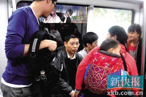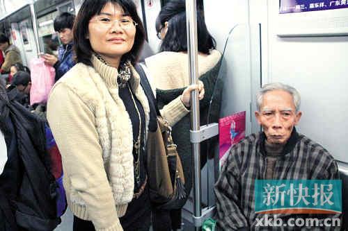 ■地铁一号线上,外地来广州办事的莫小姐虽然面显疲倦,但一见老人上车就起身让座。评选理由来广州办事的外地人,累了一天,但见到老人家还是主动让座。广州欢迎你!(摄影:谭银笑)