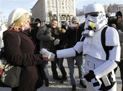 20日,乌克兰,一名相信末日说的星战迷向路人发盐。