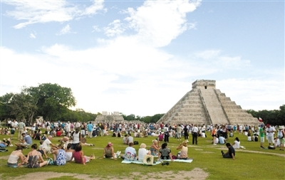 20日,墨西哥玛雅遗址前,游客参加“世界末日”庆祝活动。