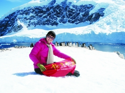 扬子晚报记者顾燕与南极的主人企鹅合影。