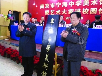 龙虎网讯 12月18日,由南京市教育局、鼓楼区政协主办,鼓楼区教育局、宁海中学、江苏金泓文化发展有限公司承办的“宁海中学美术馆揭牌暨艺术大家进校园”活动在宁海中学举行。江苏省、南京市及鼓楼区领导参加了开幕式,活动现场宁海中学聘请了艺术大家沈鹏、冯远、杨晓阳、喻继高、张道兴、孙克、杜滋龄、言恭达、高云、孙晓云、龚文桢、徐培晨、赵俊生、左庄伟、邢健健、李啸为特聘导师。同时还做了艺术大家和百名学子共绘百米长卷迎接2014年青奥会活动。