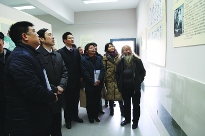 鼓楼区区委书记、人大主任陆平贵与中国工笔花鸟画大师喻继高为宁海中学美术馆揭牌。