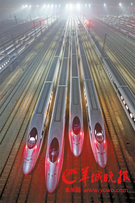 25日凌晨,众多京广高铁列车停靠在武汉动车基地,蓄势待发 新华社发