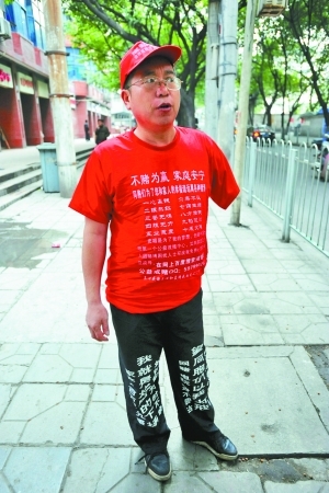 张延文穿着印有宣传戒赌字样的衣服,讲述自己曾因赌博带来的危害。重庆晨报记者 李斌 摄
