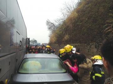 据内江市公安消防支队相关负责人介绍,一辆银白色小轿车内有三名女子和一名男子被困,但由于事故车辆数目较多,造成高速公里拥堵,救援消防车在距离事发地点约3公里处被堵住。消防员携带救援装备采取逐段搭乘和奔跑的方式前行。下午3点55分,首批消防官兵抵达事故现场,将四名被困者救出。