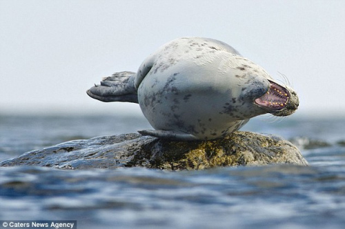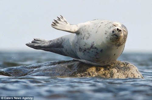 照片中,这只可爱的海狮侧卧在露出水面的石头上,微闭着眼睛,伸展着鳍状肢,尽情地享受阳光的温暖。有时,海狮还张开大嘴,似乎在做深呼吸。