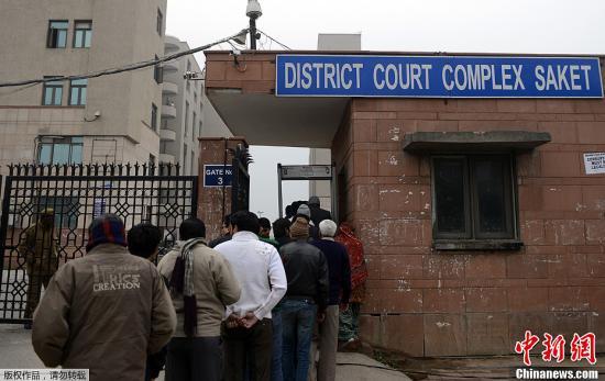 当地时间1月3日,印度新德里地方法院对印度黑公交轮奸案嫌犯进行庭审。图为当地法庭外警方严密检查旁听者以防不测。