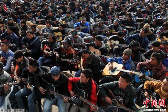 当地时间1月3日,印度大吉岭,约600名乐手集体进行吉他演奏,悼念23岁的轮奸案遇害女大学生。