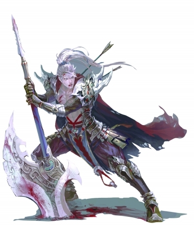 欧阳林君舞动双面斧。他身边的武器架上竖立着很多奇怪的冷兵器。