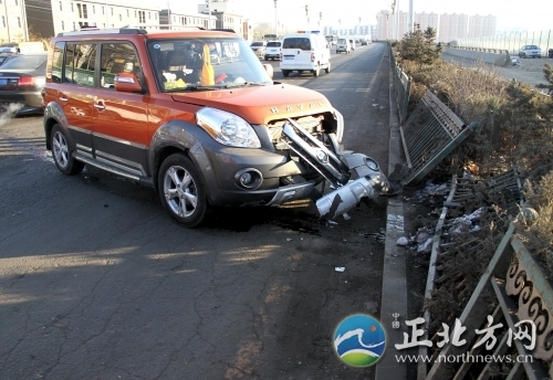 1月17日16时许,呼和浩特市金桥开发区金桥大桥上发生一起交通事故,一名身着城管制服的男子酒后驾驶一辆长城牌两厢轿车撞上了一辆黑色轿车后,又撞断了桥上护栏,最后停在了逆向车道的绿化带前……