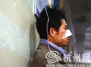笕桥医院,一名安装工鼻梁和左手包着厚厚的纱布,正在楼道里输液,他姓周,事发时正在室内负责控制电源开关。另一名安装工姓骆,事发时在负责室外检修,满脸暗黑,嘴唇和眼睛肿大,头发眉毛全部烧焦,正躺在病床上呻吟。
