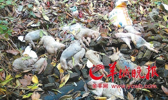 羊城晚报江门讯记者赵应齐摄影报道: 十几只死猪崽被抛弃在村子附近的马路边上, 腐烂的尸体上到处是舞动的蛆虫和乱舞的苍蝇,恶臭几里远。如此恶心的场面,惹得当地的村民怒火万丈,要求相关部门尽快揪出乱丢死猪者并实行严惩。