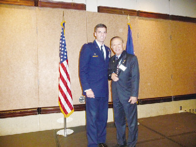 美空军基地司令颁发尹集成(右)荣誉司令官奖牌。(美国《世界日报》/崔以闻 摄)