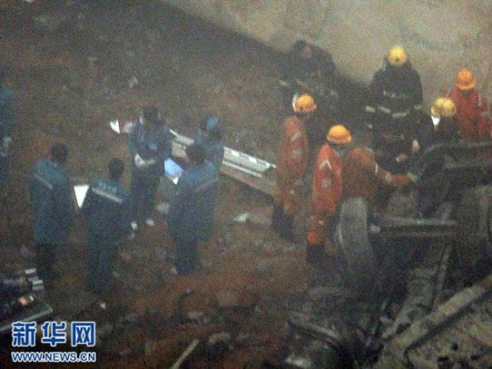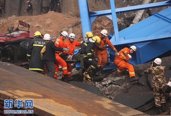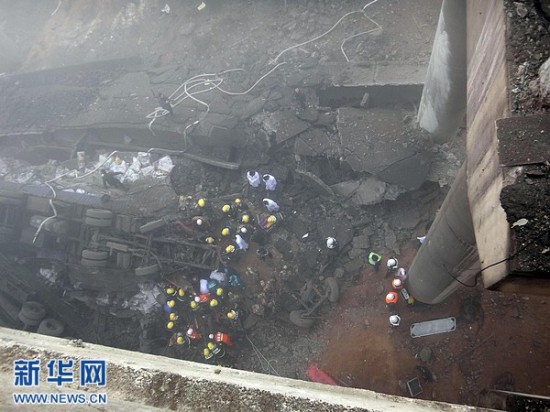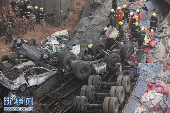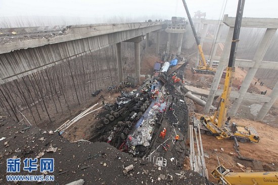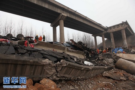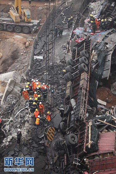 2月1日拍摄的事故救援现场。据初步了解到的情况,当天上午8时52分,连霍高速公路K741+900公里处发生桥面坍塌事故,造成连霍高速南半幅阻断。现场反馈情况疑为运输烟花爆竹车辆发生爆炸,造成桥面坍塌,导致多辆行车坠桥。新华社发(肖孟 摄)