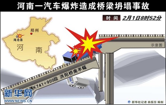 2013年2月1日 图表:河南一汽车爆炸造成桥梁坍塌 多人伤亡 目前已经造成4人死亡、8人受伤。 新华社记者 曲振东编制