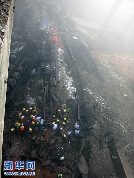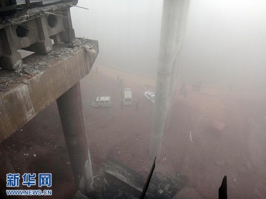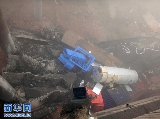 2月1日拍摄的事故现场。据初步了解到的情况,当天上午8时52分,连霍高速公路K741+900公里处发生桥面坍塌事故,造成连霍高速南半幅阻断。现场反馈情况疑为运输烟花爆竹车辆发生爆炸,造成桥面坍塌,导致多辆行车坠桥。新华社发(肖孟 摄)