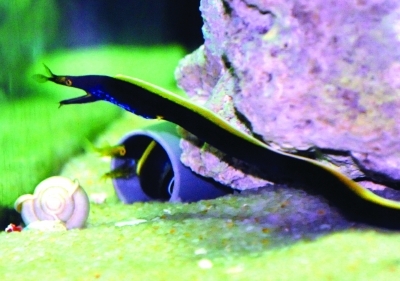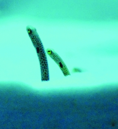 还有另一种就是胆小沙鳗,因为胆小,害怕外界影响,只要你用手拍打玻璃,沙鳗就会立刻缩进沙子里。它的身体纤细如铅笔,白天成群将下半身埋在沙里,只露出上半身。