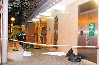 秀茂坪邨痴情汉跳楼分尸,警员将死者跌落地上断肢遮盖,免引起居民恐慌。图片来源:香港《文汇报》