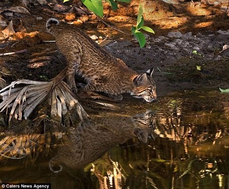 山猫俯下身子喝水