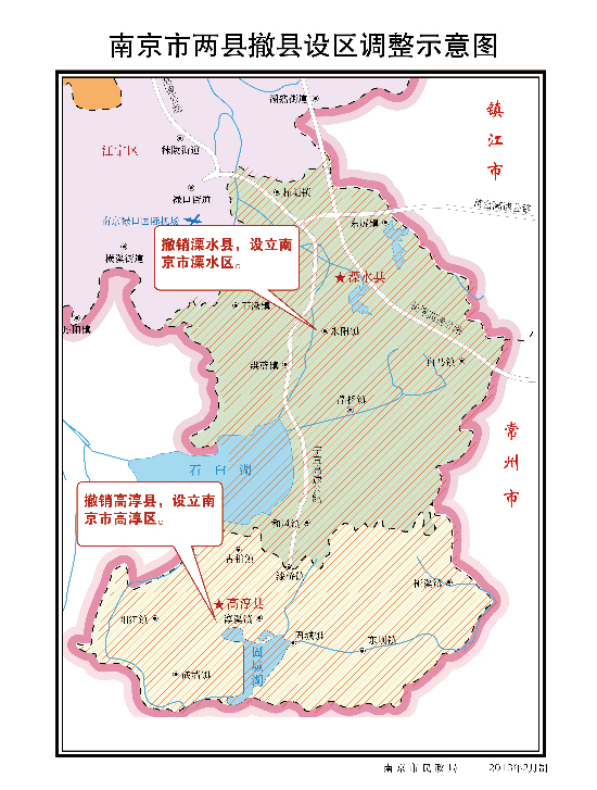 撤销溧水县,设立南京市溧水区(面积1067平方公里,人口41.93万),以原溧水县的行政区域为南京市溧水区的行政区域;