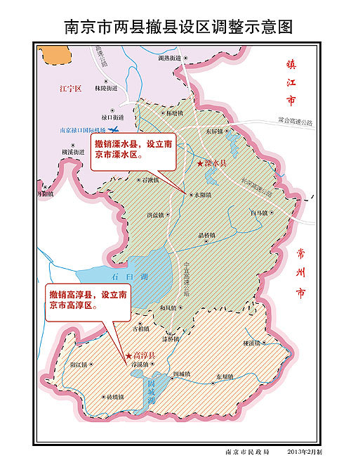 根据批复的方案,此轮区划调整中,南京市将撤销秦淮区、白下区,以原两区所辖区域设立新的秦淮区;撤销鼓楼区、下关区,以原两区所辖区域设立新的鼓楼区;撤销溧水县,设立南京市溧水区,以原溧水县的行政区域为南京市溧水区的行政区域;撤销高淳县,设立南京市高淳区,以原高淳县的行政区域为南京市高淳区的行政区域。