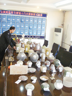 昨日,在派出所的会议室内,记者也见到了盗墓贼所使用的“洛阳铲”、“探杆”、“铁锹”、挖洞用的阔口“铳子”等盗墓工具。民警介绍,这些都是盗墓者使用的盗掘文物工具,其中叫“铳子”的工具还是头一次见到。这些洛阳铲、探杆等工具都经过盗墓贼的改良,使用起来很方便。 警方请文物考古专家对被盗的文物及工具进行鉴定时,专家表示,这伙盗墓贼所使用的盗墓工具,比较“先进”。