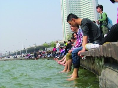 昨天南京天气炎热,最高气温突破30摄氏度。不少在南京火车站站前广场候车的旅客脱下鞋子,坐在玄武湖边的亲水平台上,感受一把湖水的清凉。徐福庚肖雷 摄