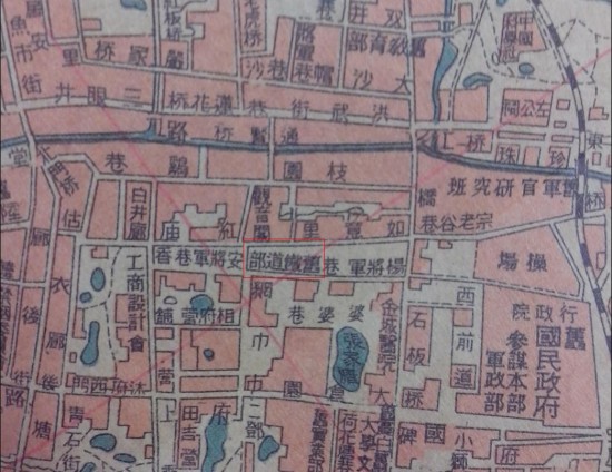 1940年的南京地图上,标注了“铁道部”成立的位置(已用红框标示出)。